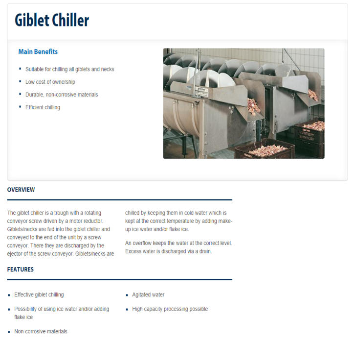 The consumption of valuable giblets is on the increase and the pet food market offers interesting possibilities too.Harvesting and processing giblets can be done manually, semi- automatically fully automatically, depending on the arrangement you choose. After harvesting giblets must be washed and chilled. We offer suitable logistical options for doing this.